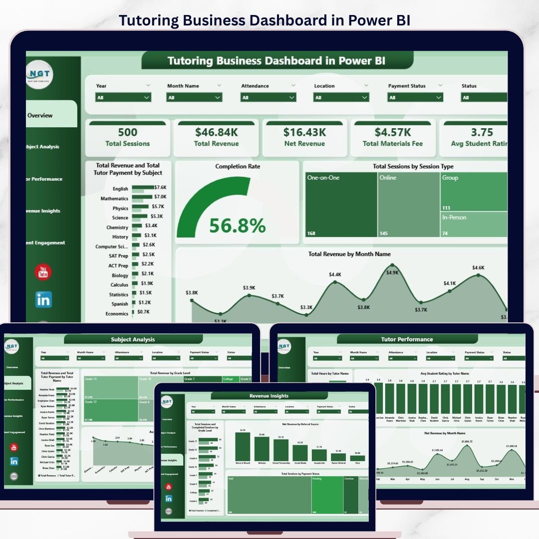 The Tutoring Business Dashboard in Power BI tracks 5 core KPIs — Total Sessions, Total Revenue, Net Revenue, Total Materials Fee, and Avg Student Rating — across 5 fully interactive pages with 15+ pre-built visuals and multi-level slicers. Setup takes under 10 minutes: open the .pbix file in Power BI Desktop, replace the sample data, and every chart, card, and filter refreshes automatically.