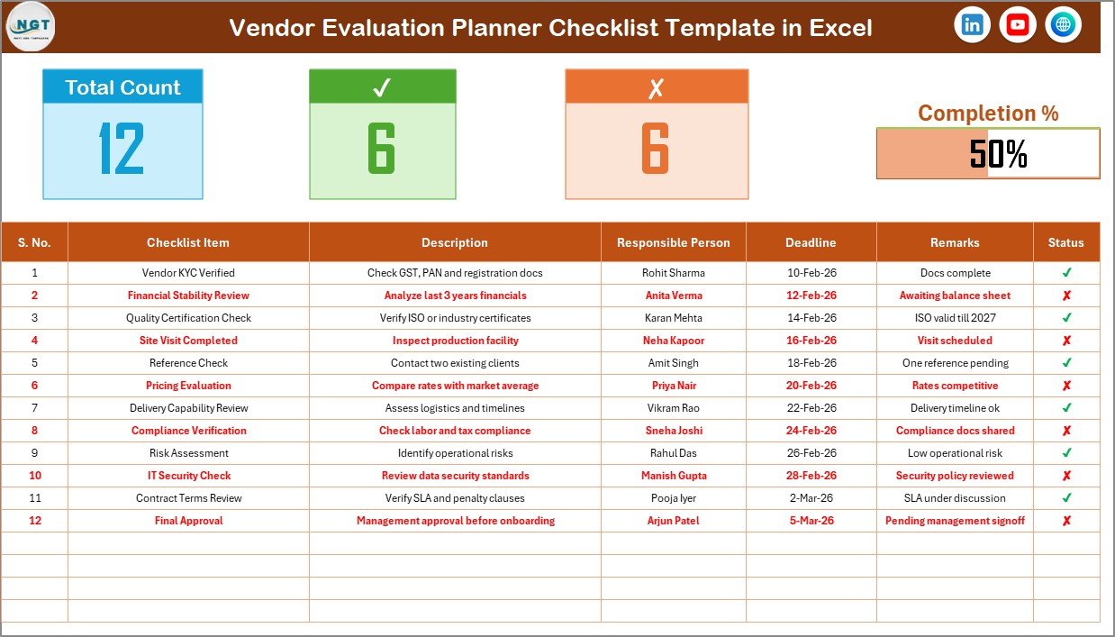 Instead of managing vendor reviews manually, this structured Excel checklist gives you clarity, accountability, and visual progress tracking — all in one place.
