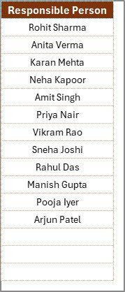 🔽 Drop-down Validation List – Avoid typing errors with controlled responsible person selection.