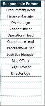 This sheet stores the list of Responsible Persons for dropdown selection. It ensures standardized entries and clean data management.