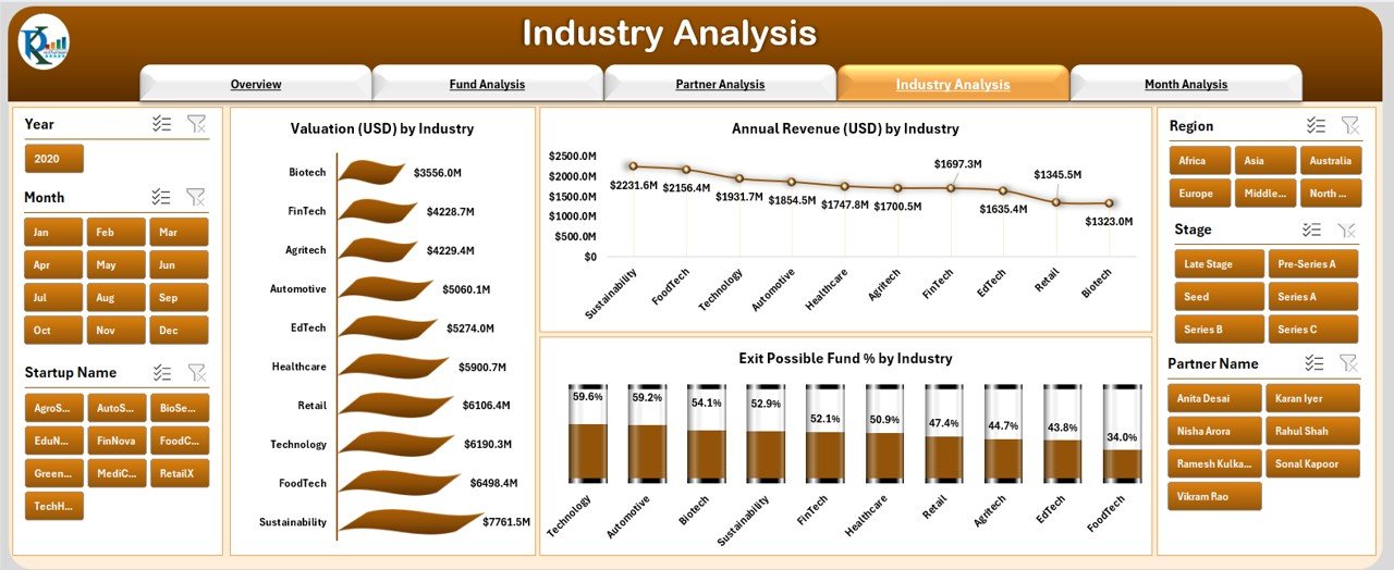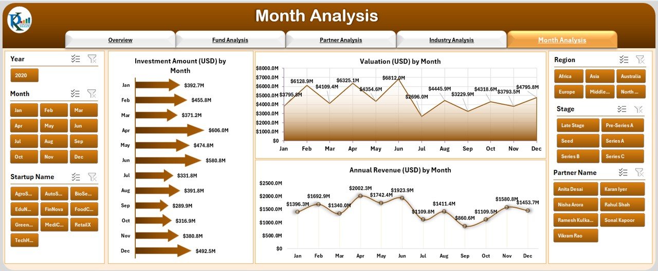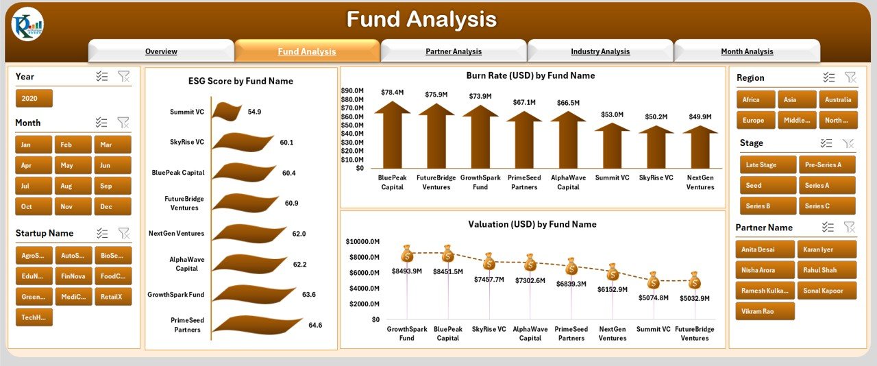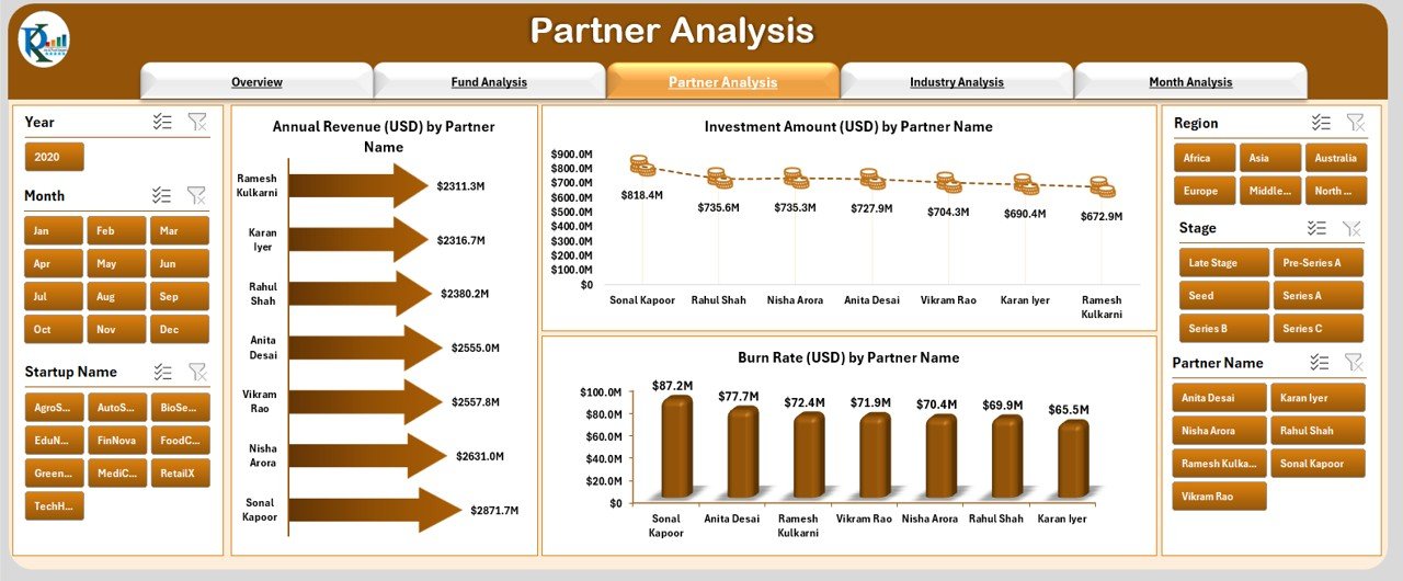 3. Use slicers to filter by fund, partner, industry, stage, or month.