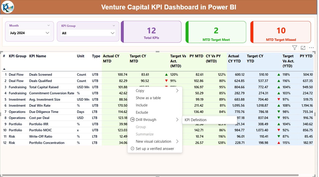 ✅ Key Features of Venture Capital KPI Dashboard in Power BI