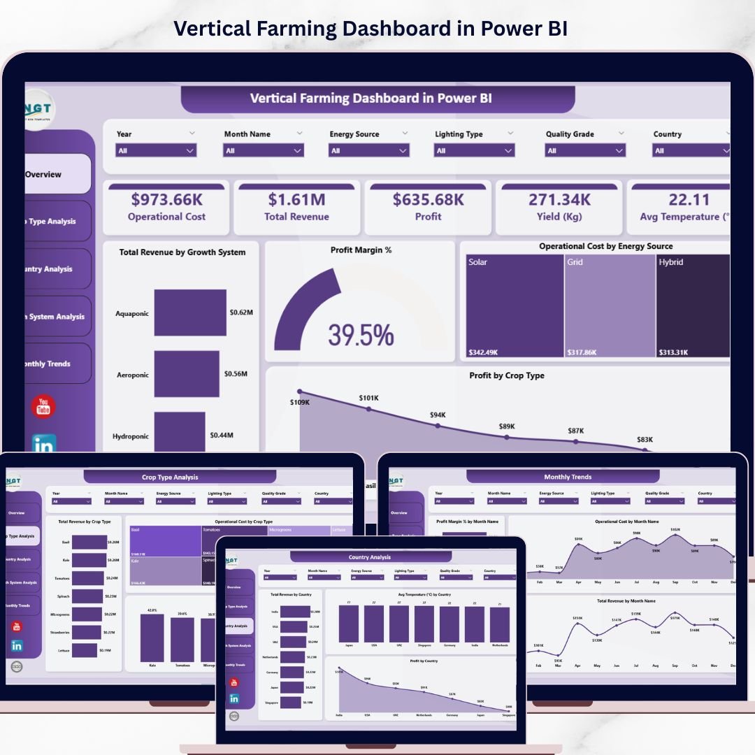 Vertical Farming Dashboard in Power BI is a powerful, ready-to-use analytical solution designed for modern indoor farming businesses that want to track operational costs, revenue, profit, yield, and temperature metrics in one centralized interactive report. Managing vertical farming operations can quickly become complex when you need to monitor crop performance across multiple growth systems, energy sources, countries, and time periods simultaneously. Instead of relying on scattered spreadsheets, this dashboard in Power BI brings all your critical metrics together in beautifully designed visual pages that update dynamically with your data.