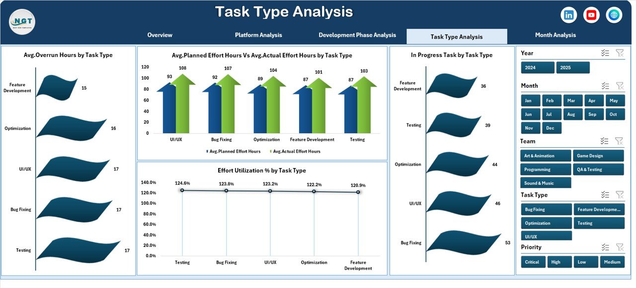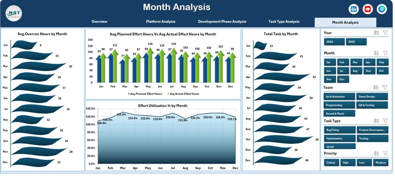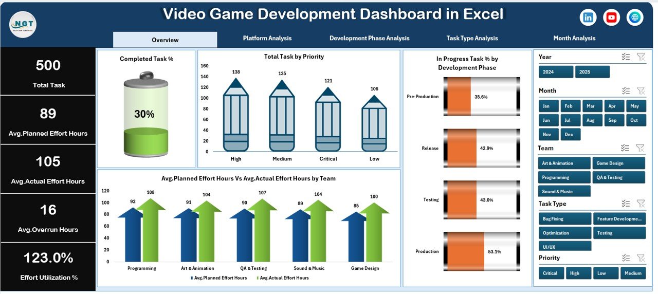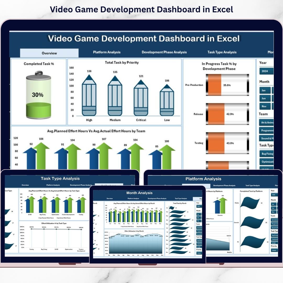This ready-to-use Excel dashboard is designed specifically for game development teams that want complete visibility into tasks, effort utilization, and project progress—without using complex tools or expensive software. It transforms raw project data into clear visuals that help teams stay on track and deliver games on time.