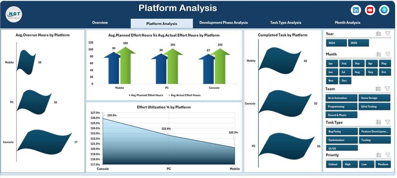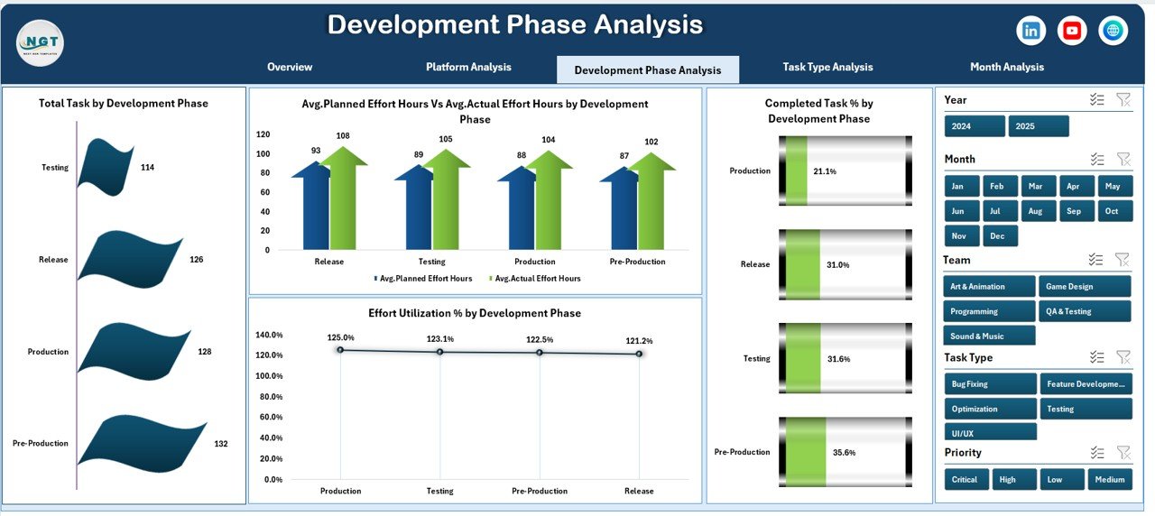 Analyze performance by platform, development phase, task type, and month using slicers.