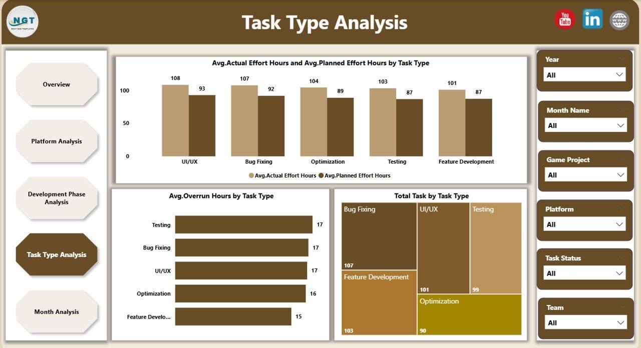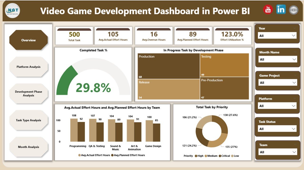 This ready-to-use Power BI dashboard converts raw development data into interactive, visual, and actionable insights. It gives producers, project managers, leads, and studio heads a single, centralized view of tasks, effort, overruns, and priorities—so teams can make faster decisions and deliver games on time and within budget.