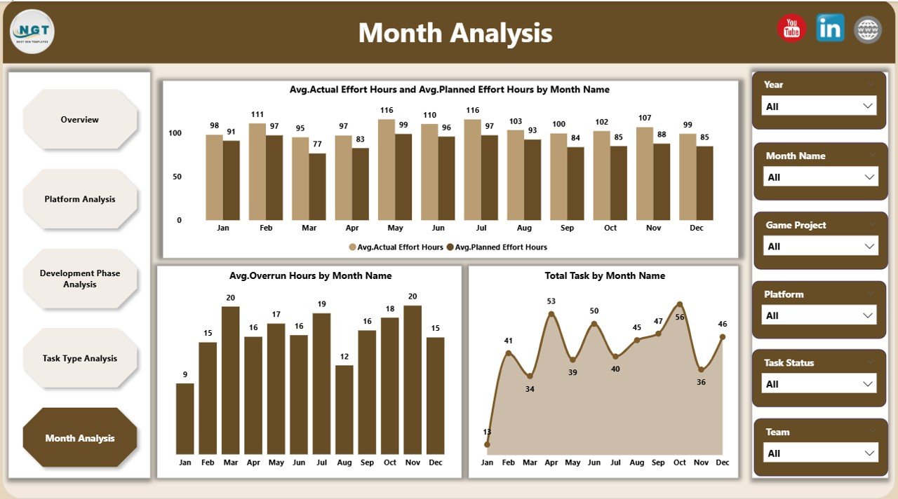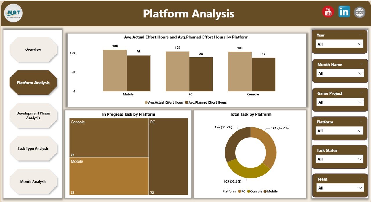 Analyze performance by platform, development phase, task type, priority, and month using slicers.