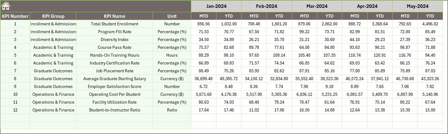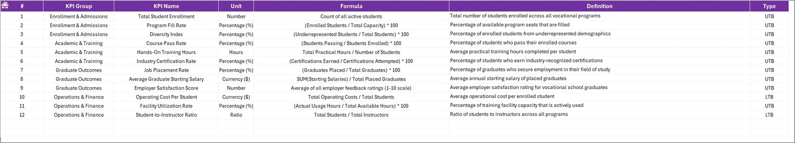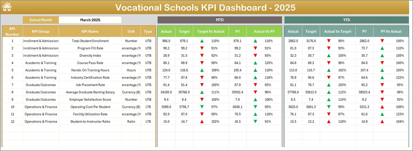 Our Vocational Schools KPI Dashboard is a fully digital, ready-to-use Excel-based tool designed for seamless integration into your existing workflow. It includes: