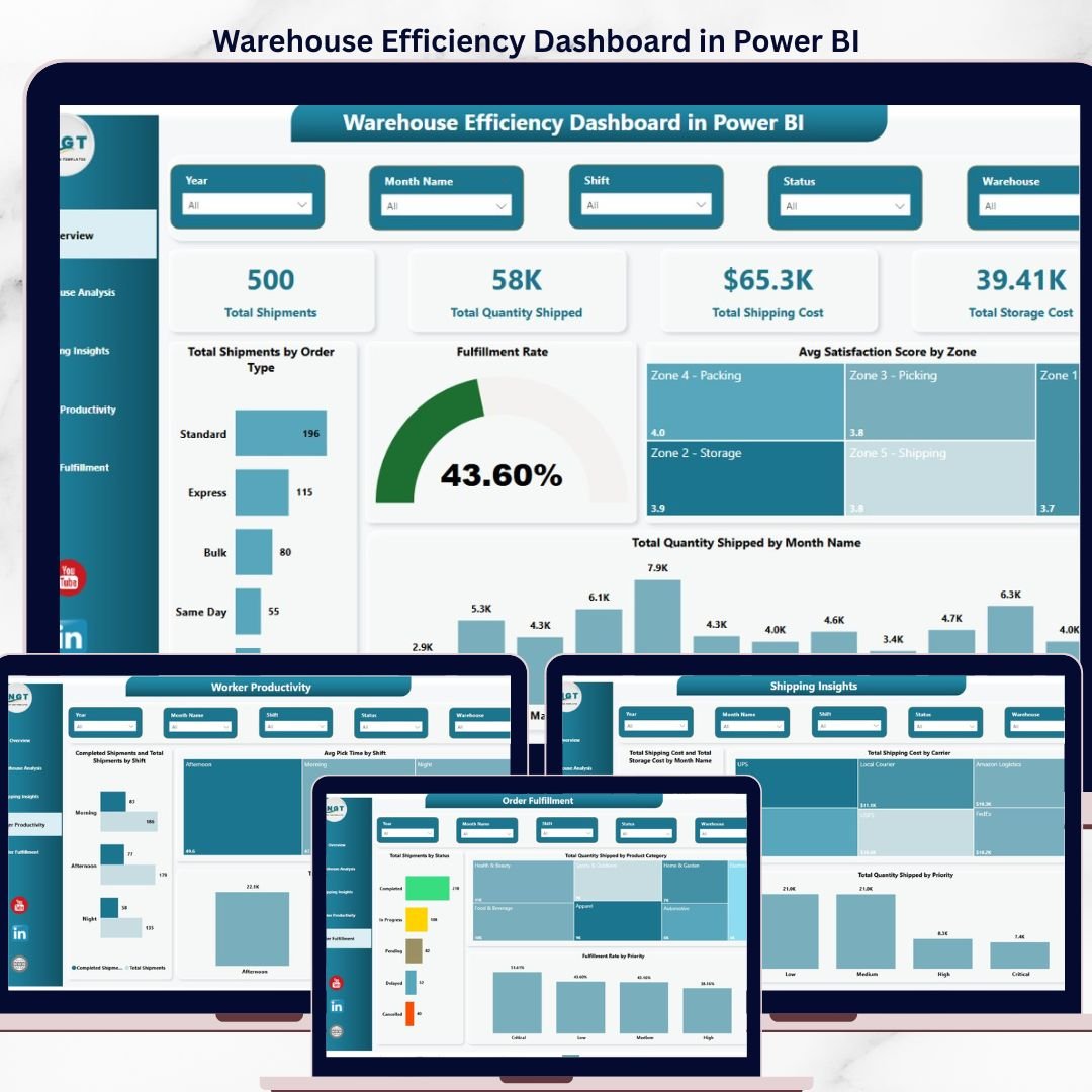 • 🔹 5-page Power BI dashboard (.pbix) – Overview, Warehouse Analysis, Shipping Insights, Worker Productivity & Order Fulfillment