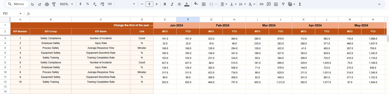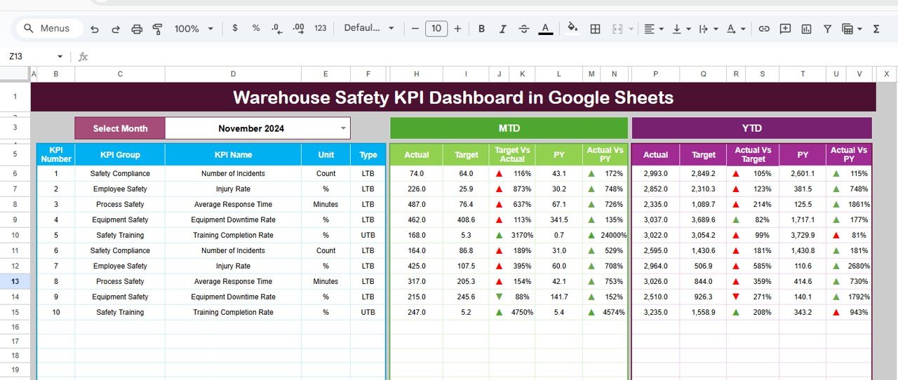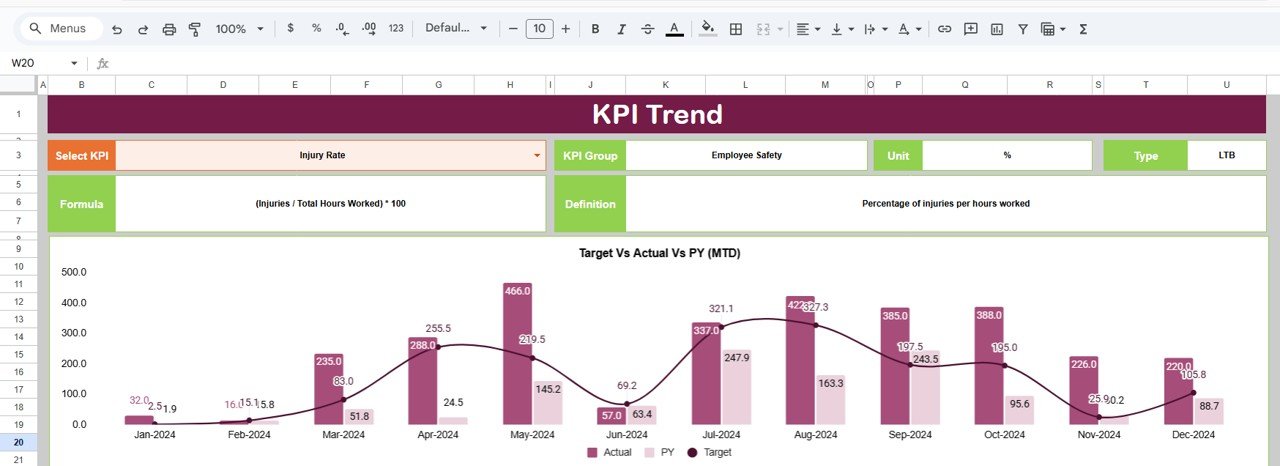 This dashboard helps you track safety KPIs, monitor MTD and YTD performance, compare targets with actual numbers, and evaluate previous year trends — all in one collaborative Google Sheets file.