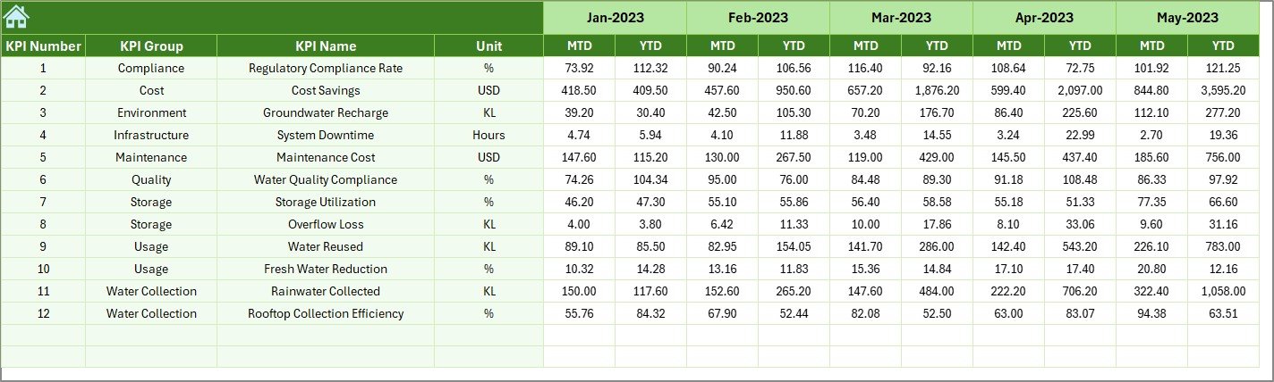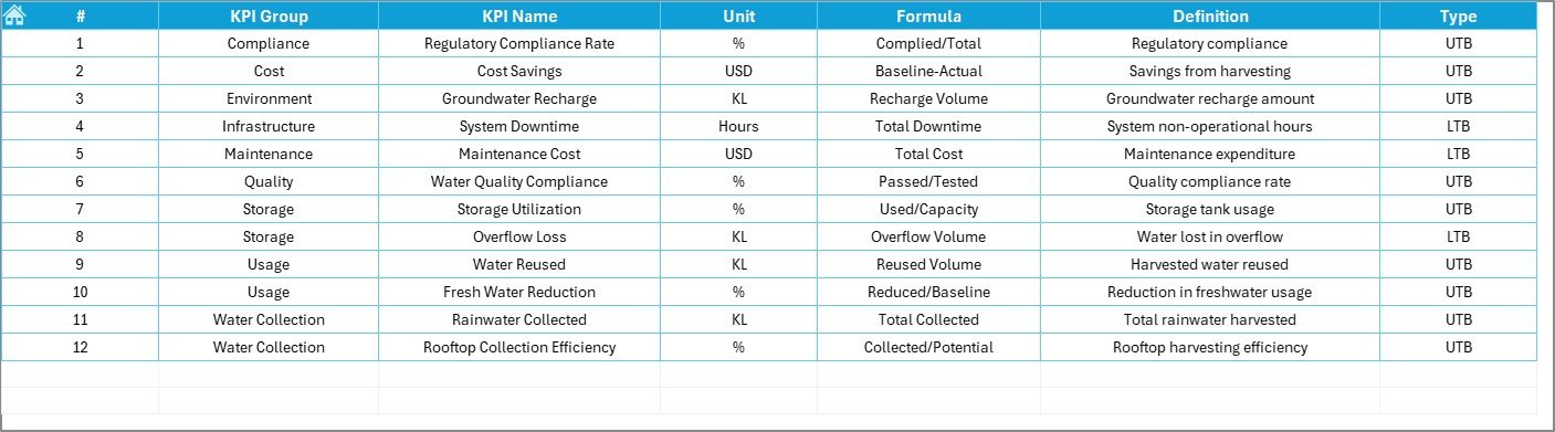 📂 What’s Inside the Water Harvesting KPI Dashboard in Excel
