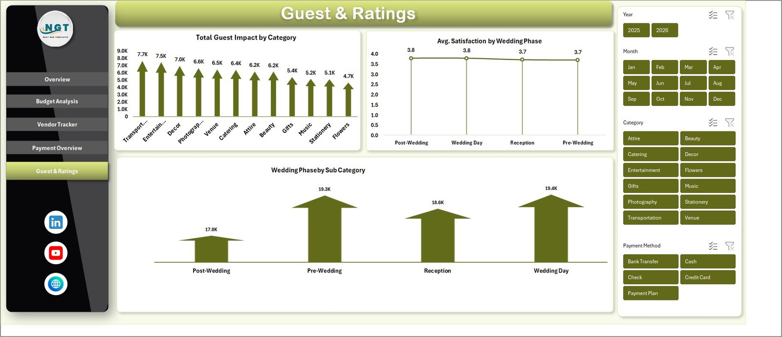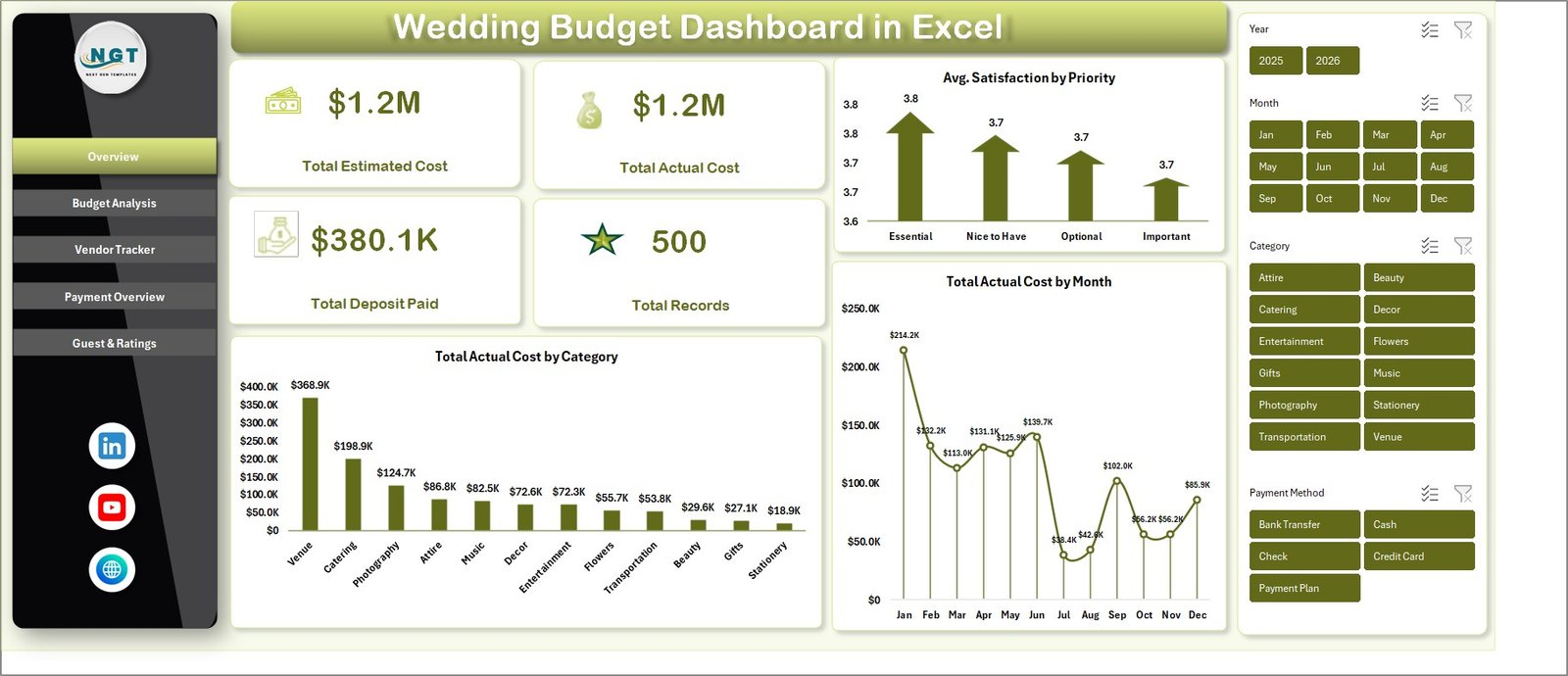 📌 5 Interactive Dashboard Pages – Overview, Budget Analysis, Vendor Tracker, Payment Overview, and Guest & Ratings pages provide a comprehensive view of your wedding finances from every angle.