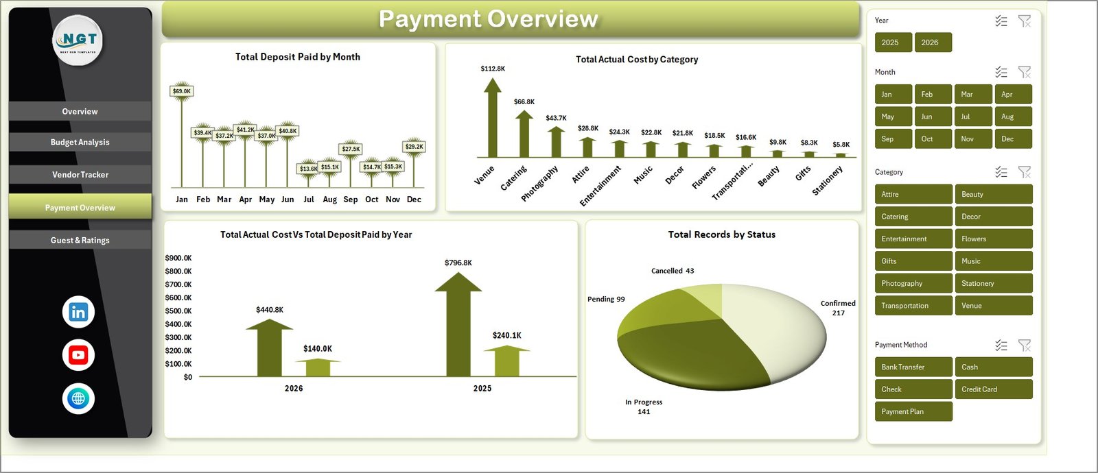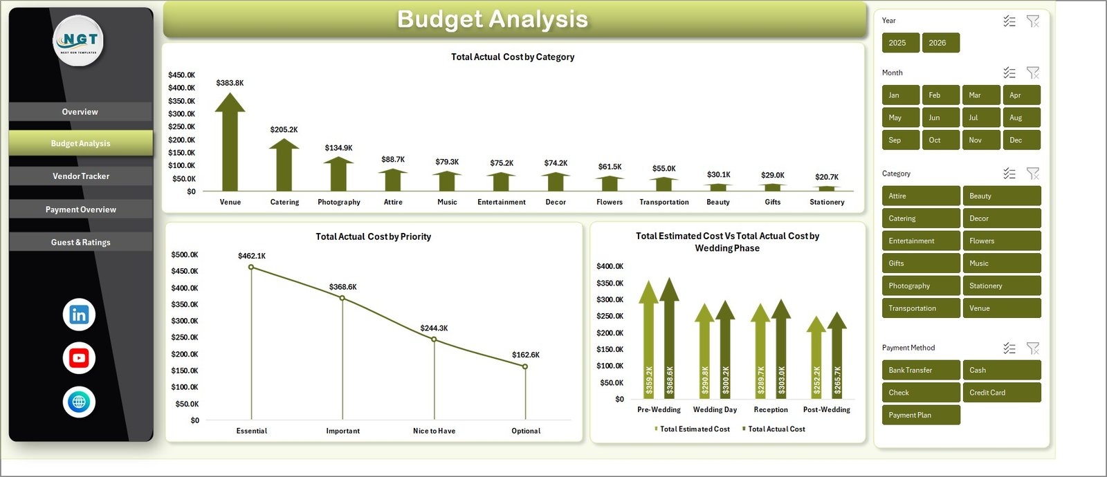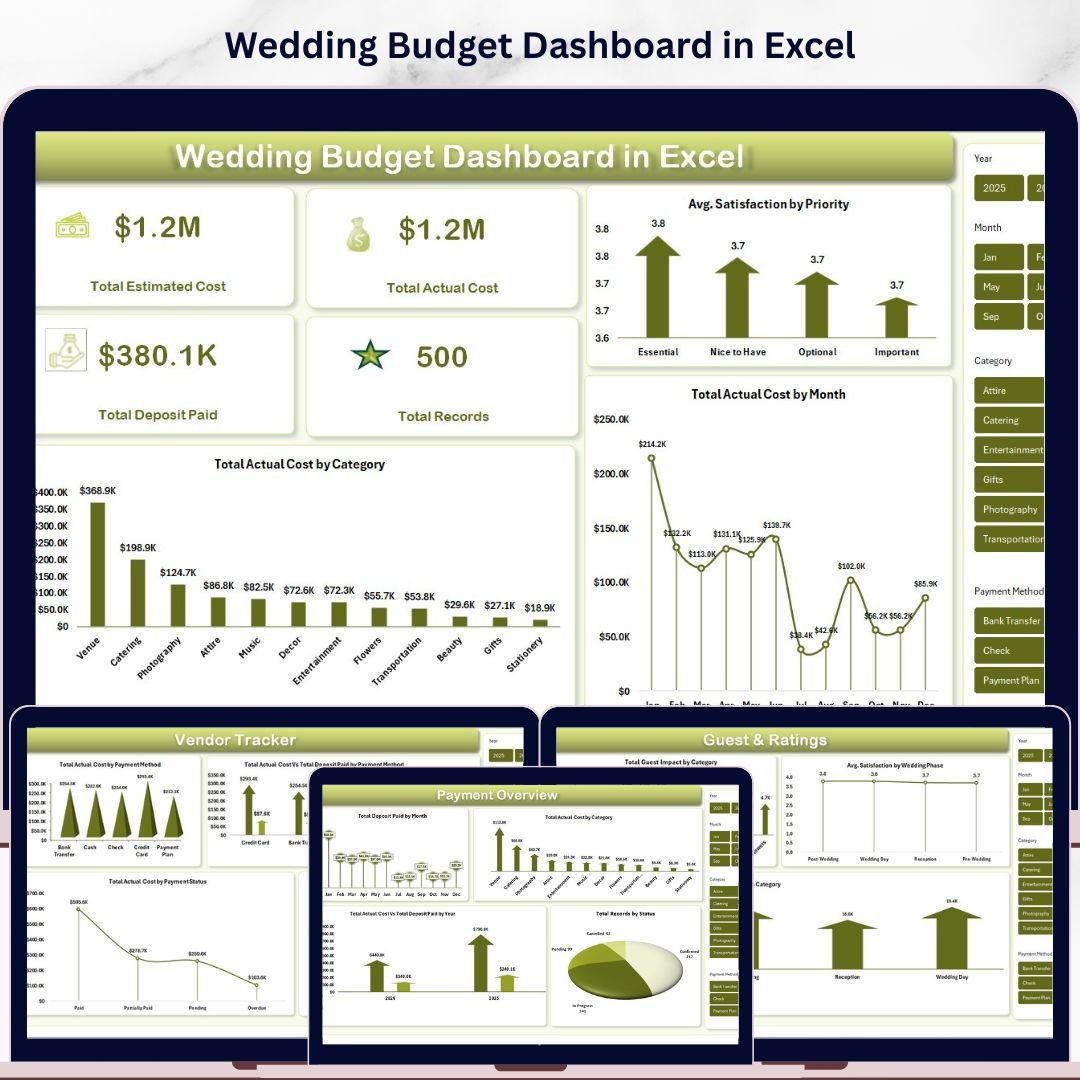 Unlike basic spreadsheets, this template includes 5 interactive dashboard pages with visual charts, KPI cards, slicers for instant filtering, vendor tracking, payment analysis, and guest impact metrics — giving you a complete financial picture of your wedding planning.