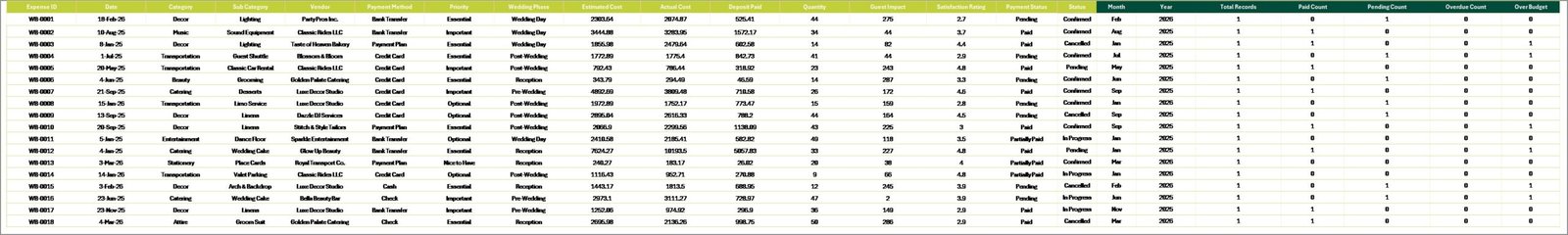 Guest & Ratings📊 Data Sheet – This is where you enter all your wedding budget data. Simply add your records in the same format provided and the entire dashboard updates when you refresh.