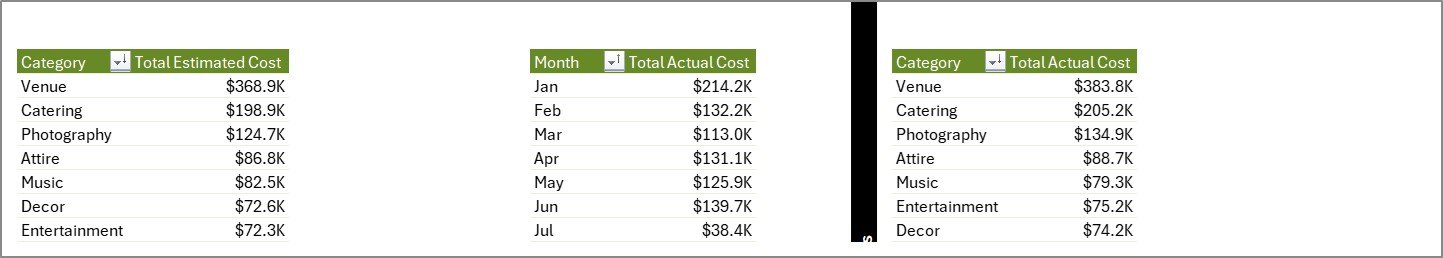 Wedding Budget Dashboard in Excel📊 Budget Analysis Page – Deep dive into your spending with Total Actual Cost by Category, Total Actual Cost by Priority, and Total Estimated Cost vs Total Actual Cost by Wedding Phase.