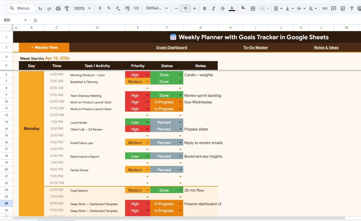 ✨ Interactive Weekly View Dashboard with 6 Data Fields – Plan every day with Day, Time, Task/Activity, Priority, Status, and Notes fields for complete weekly scheduling.Weekly Planner with Goals Tracker in Google Sheets