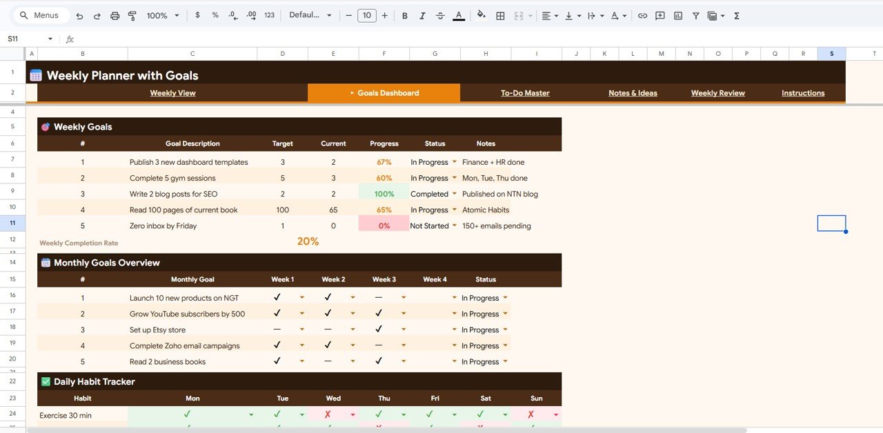 🎯 Goals Dashboard – Set and monitor weekly goals with Target, Current, Progress, and Status tracking. View Weekly Completion Rate at a glance, track Monthly Goals Overview by Week for long-term patterns, and use the Daily Habit Tracker by Day of the Week to build consistency.