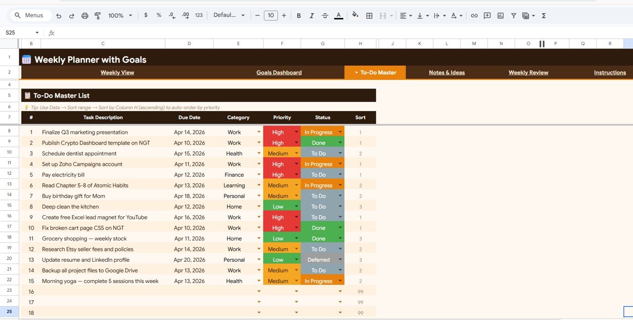 📝 To-Do Master with Auto-Sort – Manage tasks with Task Description by Due Date, Tasks by Category, Tasks by Priority Level, Tasks by Status, and an intelligent Auto-Sort by Priority feature.Weekly Planner with Goals Tracker in Google Sheets