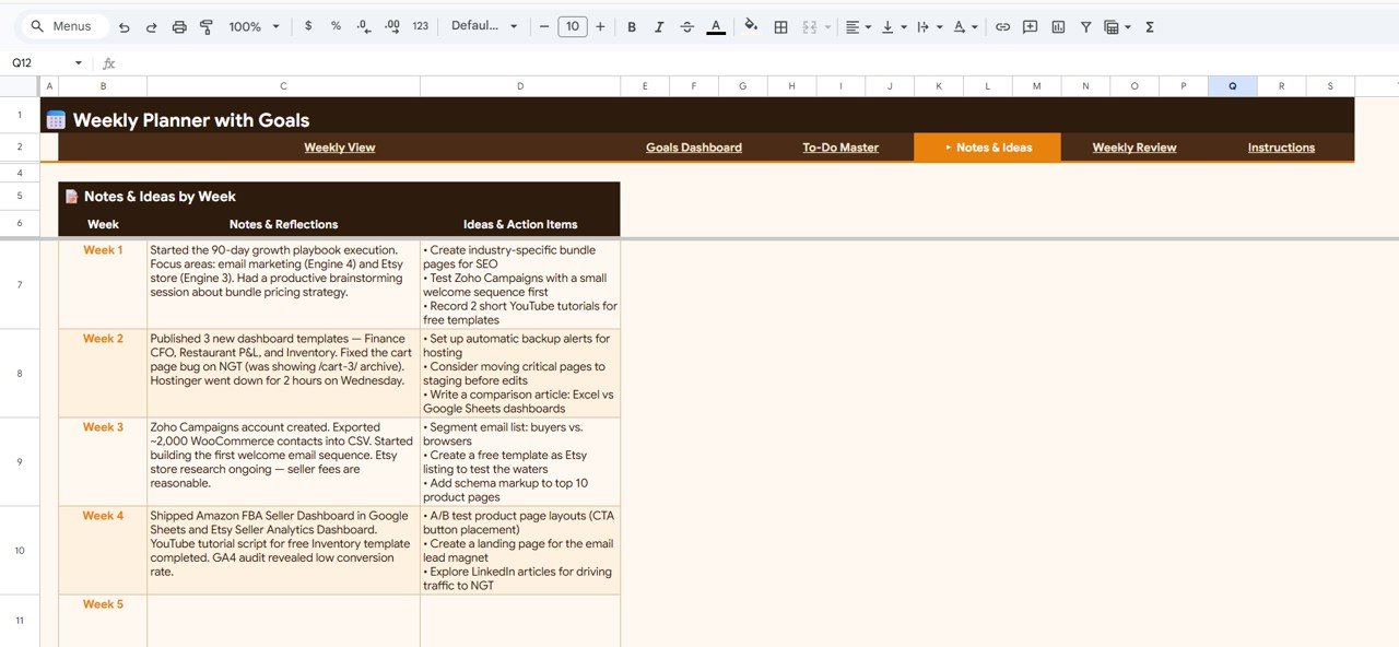 5️⃣ Capture ideas and reflections in the Notes & Ideas page throughout the week.