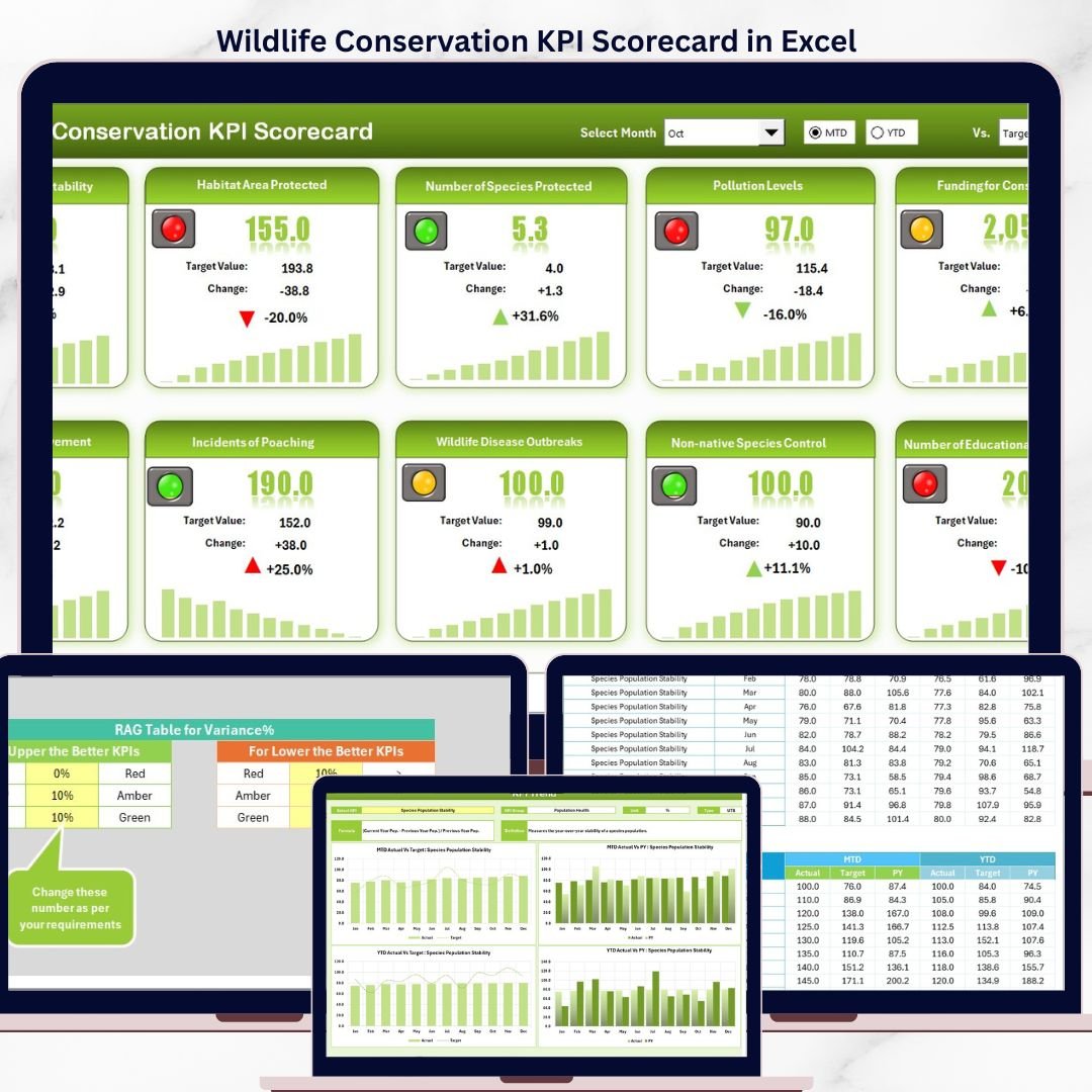 Wildlife Conservation KPI Scorecard in ExcelThe Scorecard sheet is the main interface where you can view KPI performance. Key features include: