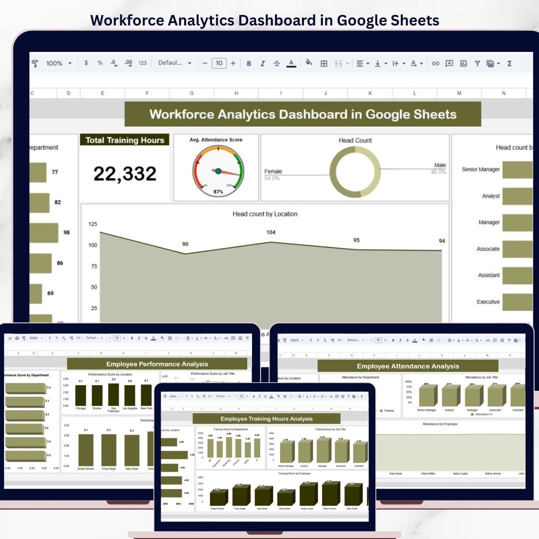 The Workforce Analytics Dashboard in Google Sheets tracks 3 KPI cards — Total Training Hours, Average Attendance Score, and Head Count — plus detailed breakdowns of salary, training, performance, and attendance across 4 dimensions each (Department, Location, Job Title, Employee).